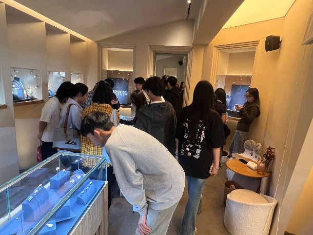 师生们先后参观了十九件珠宝设计公司和春生艺术珠宝的设计工坊、展厅等。公司负责人详细介绍了品牌理念、市场定位、创意构思和加工工艺等行业情况。同学们零距离接触了精美的珠宝艺术作品与精湛的制作工艺,并就设计灵感来源、材料特性、市场趋势、技术难点及职业发展路径踊跃提问,交流环节气氛热烈,深入了解了市场消费趋势、新材料应用及数字化营销策略,对行业生态有了更全面的认知。