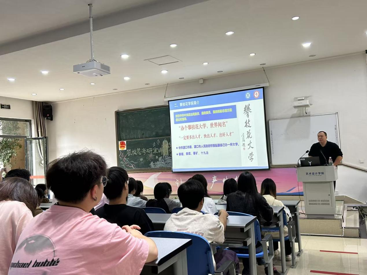 陈老师围绕攀枝花市地理位置、攀枝花学院概况以及艺术学院办学情况等多个维度展开详细介绍。其中,宣讲重点聚焦于攀枝花学院设计专业硕士点的鲜明特色,以及研究生奖助政策。