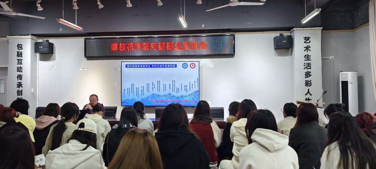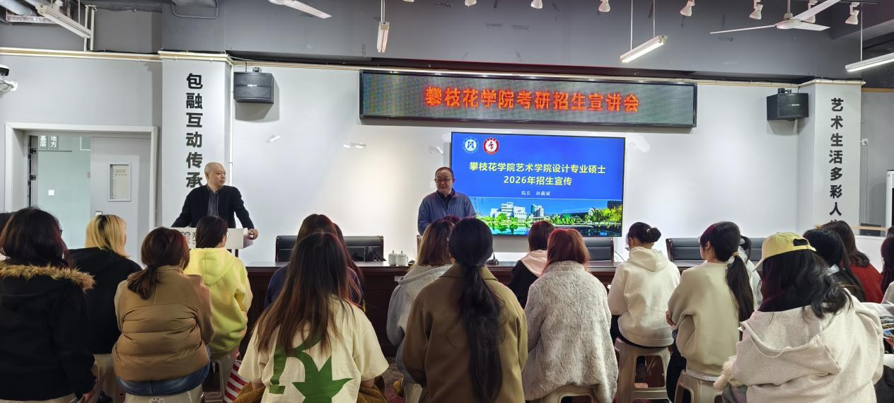 宣讲会上,孙载斌从攀枝花市地理位置,攀枝花学院基本情况,艺术学院办学历史、硕士培养目标、培养条件、奖助政策等方面开展介绍。重点介绍了攀枝花学院设计专业硕士点特色,特别强调了校内导师的专业背景与研究方向,校外导师的行业引领与专家权威。