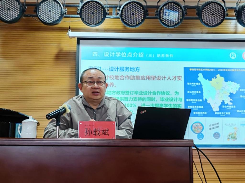 宣讲会上,孙载斌从攀枝花市地理位置,攀枝花学院基本情况,艺术学院办学历史、硕士培养目标、培养条件、奖助政策等方面开展介绍。重点介绍了攀枝花学院设计专业硕士点特色,特别强调了校内导师的专业背景与研究方向,校外导师的行业引领与专家权威。