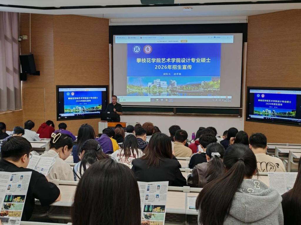 10月11日上午,攀枝花学院艺术学院副院长蒲泽敏赴成都工业学院开展设计专业硕士招生宣讲,会议由成都工业学院人文与设计学院副院长党锐主持,他对蒲泽敏副院长一行的到来表示感谢,并寄语在场60余名设计本科专业考研意向同学把握机会,合理规划考研方向。
